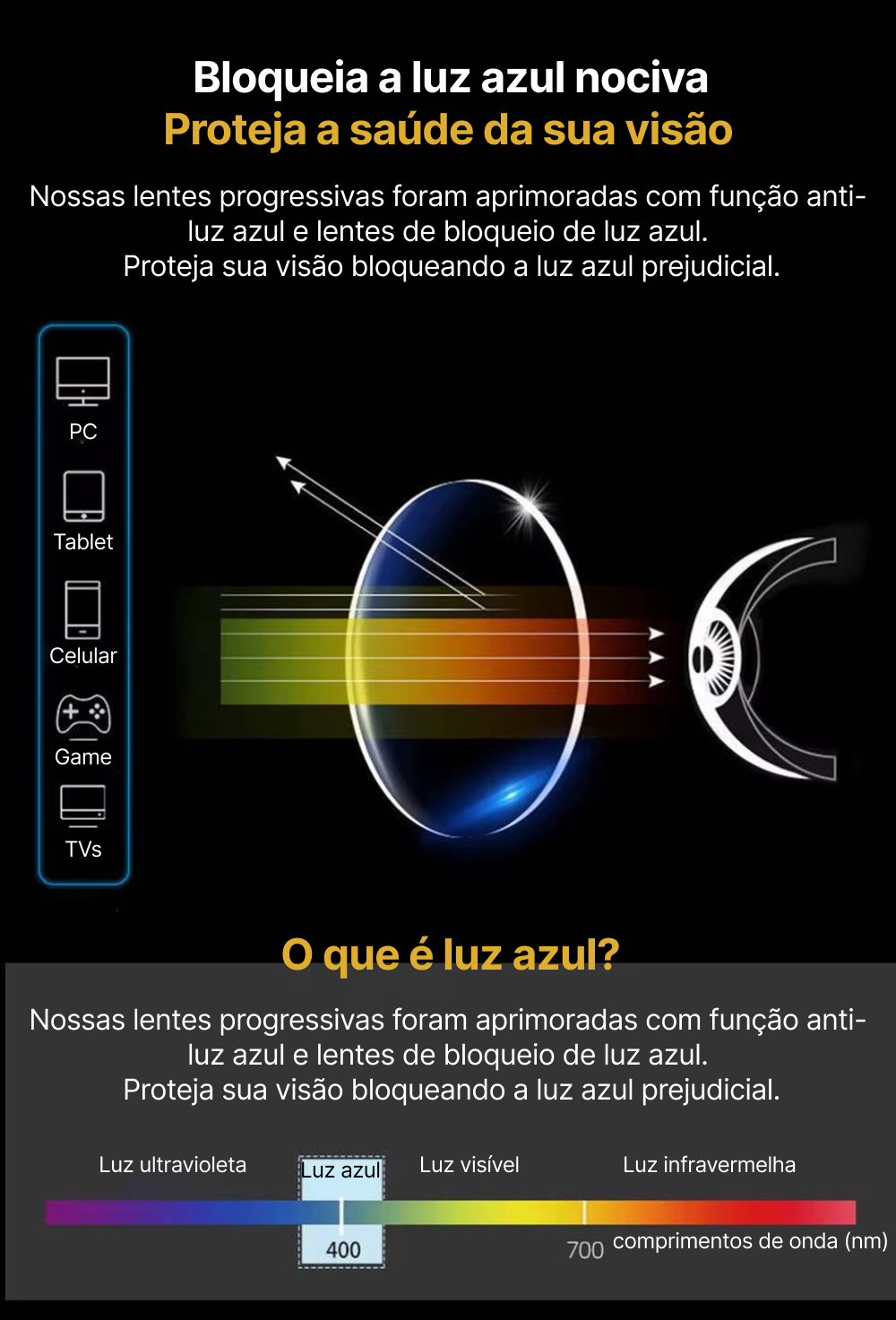 | Grau da lente (+) | +0.5, +1.0, +1.5, +2.0, +2.5, +3.0, +3.5, +4.0, +4.5, +5.0, +5.5, +6.0 |