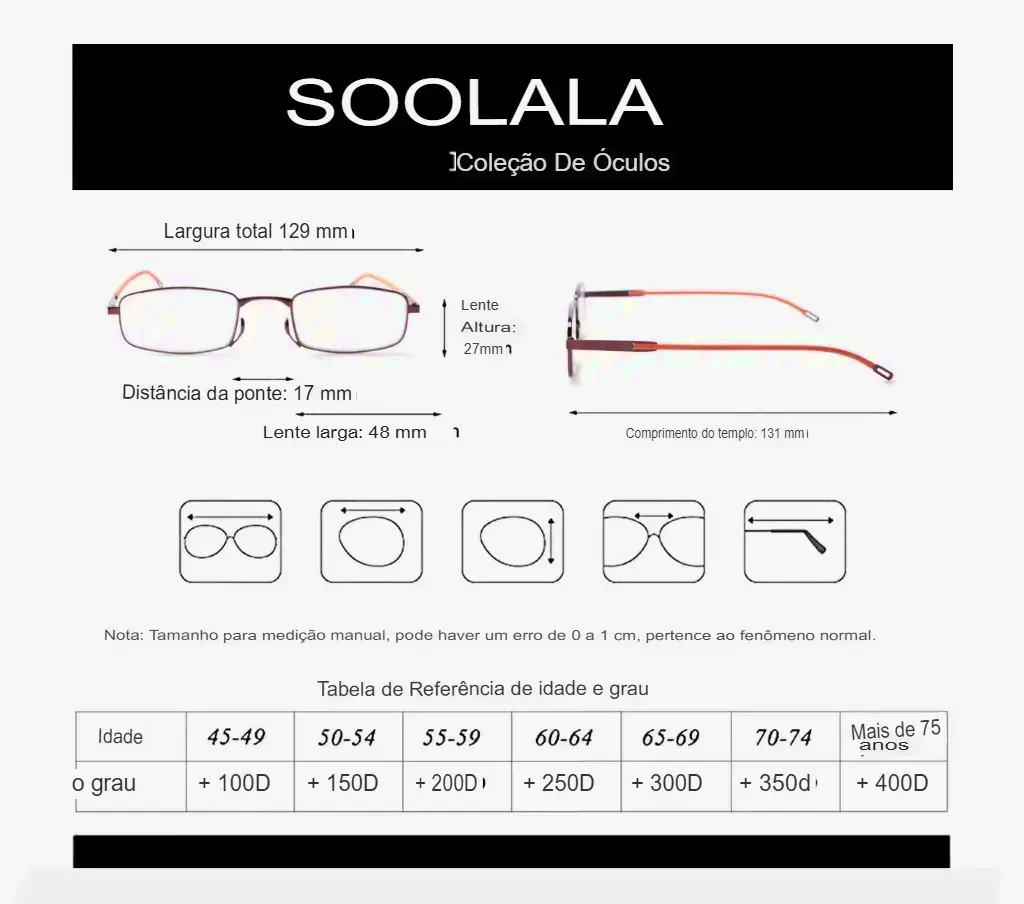 - Graus Disponíveis: De +1.00 até +3.50 (lentes para leitura/perto)