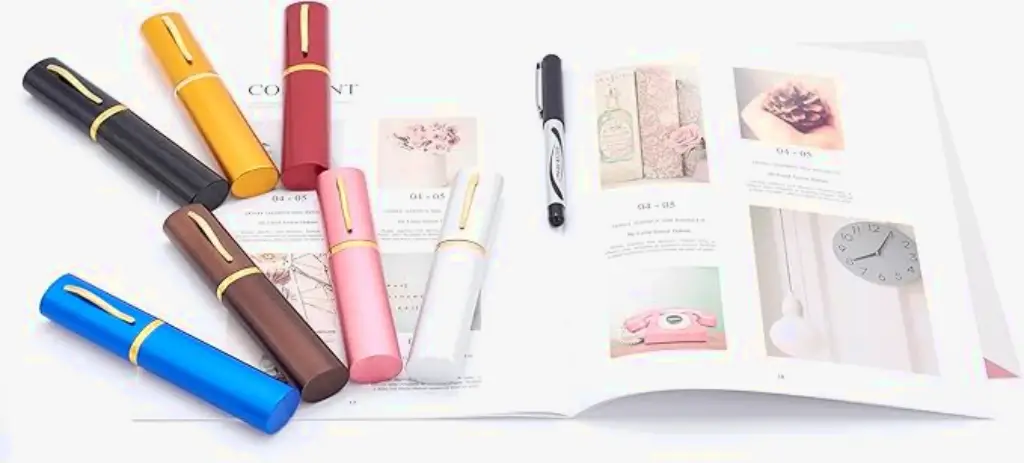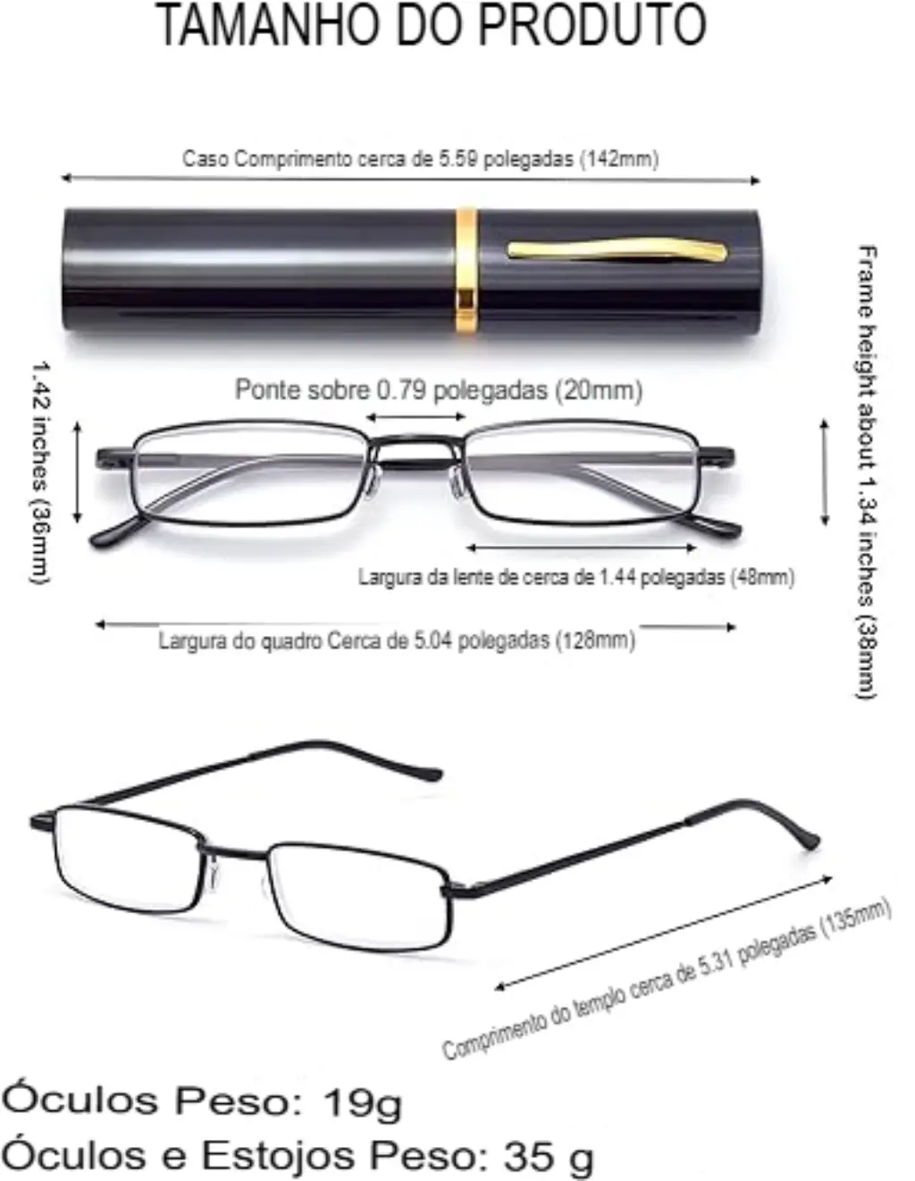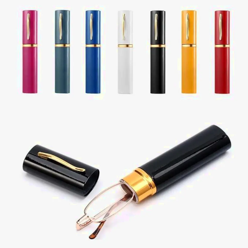 - Estojo de Armazenamento Exclusivo: Inclui um estojo protetor em formato de tubo (dimensões: $14.7 \times 2.7 \times 1.8 \text{ cm}$), equipado com um clipe. Este estojo permite o armazenamento seguro e o acesso imediato aos óculos, fixando-os a bolsos, pastas ou cadernos.